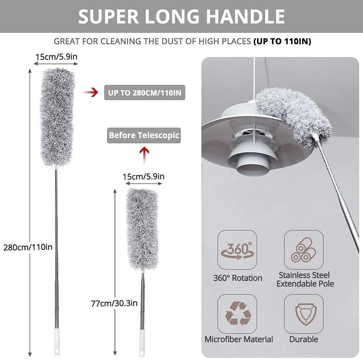 Extended Reach & Bendable Design: With its 280 cm telescopic handle, this duster can effortlessly reach high ceilings, ceiling fans, light fixtures, and other elevated surfaces. No more using unstable ladders or stools to clean those out-of-reach areas. Flexible head can be easily adjusted to various angles, allowing you to clean around corners, edges, and curved surfaces with ease.
